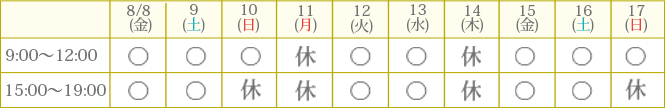 | 診療時間 | 月 | 火 | 水 | 木 | 金 | 土 | 日 | 祝 |