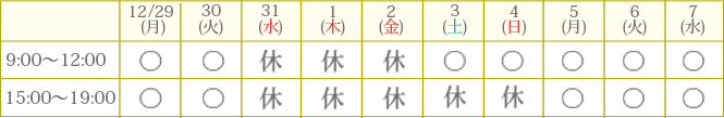 | 診療時間 | 月 | 火 | 水 | 木 | 金 | 土 | 日 | 祝 |